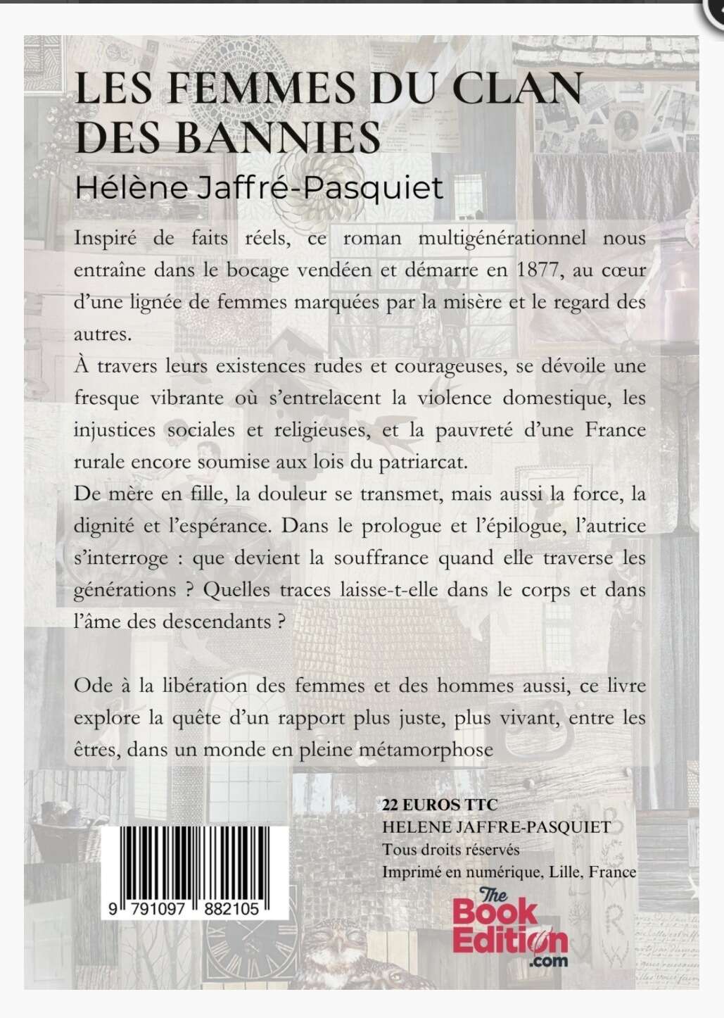 Après 12 ans de maturation, de doutes, de travail intérieur, d'interviews, de récupérations d'information, d'observations des comportements, le roman issu de faits réels de la vie de mes aïeules, voit enfin le jour... Je l'ai imaginé, rêvé comme l'histoire d'un film, celui de la vie des femmes au coeur de cette société rurale vendéenne dont je suis issue, dont les rebondissements suivent l'histoire du pays et de la région, dont les difficultés de vie tiennent en haleine..., jusqu'à rencontrer plus de lumière, laissant un outil par le questionnement qui s'en suit, notamment au travers de la conclusion et l'épilogue, destiné à reprendre le contrôle et d'accepter nos valises transgénérationnelles en les regardant autrement, en les transmutant... Mon père résumait sa vie d'enfant comme un vrai film, je crois qu'il avait raison !